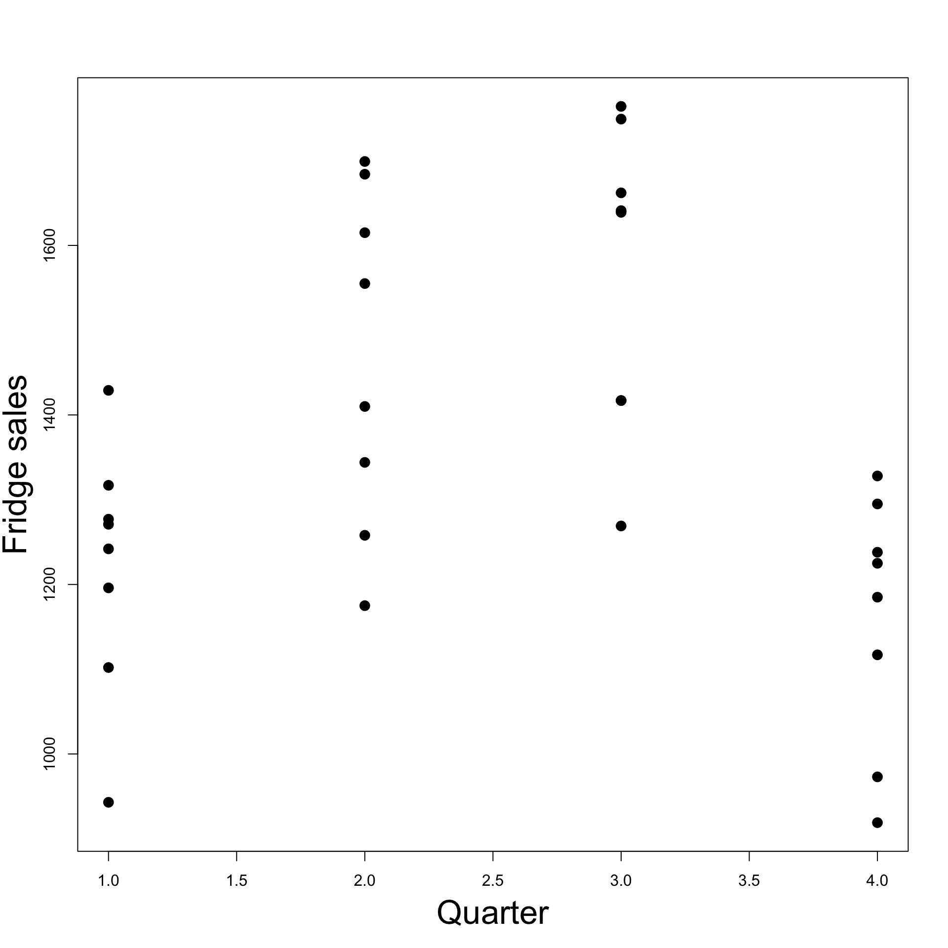 \begin{align*} {\rm I\kern-.3em E}[\text{ Fridge sales } | \text{ Q1 } = 1] & = 1222.12 \\[15pts] {\rm I\kern-.3em E}[\text{ Fridge sales } | \text{ Q2 } = 1] & = 1467.49 \\[15pts] {\rm I\kern-.3em E}[\text{ Fridge sales } | \text{ Q3 } = 1] & = 1569.75 \\[15pts] {\rm I\kern-.3em E}[\text{ Fridge sales } | \text{ Q4 } = 1] & = 1160 \\[15pts] \end{align*}