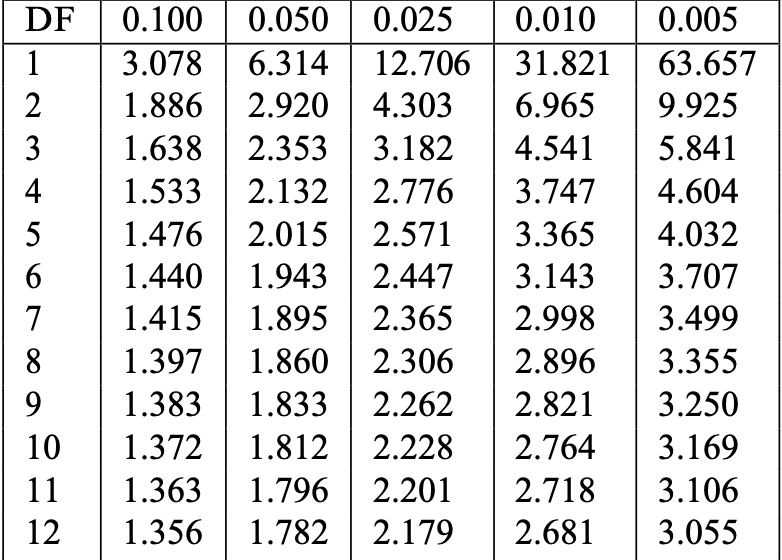 The critical value t^* = t_{n-1}(0.025) found in the table satisfies P(t_{n-1}>t^*) = 0.025