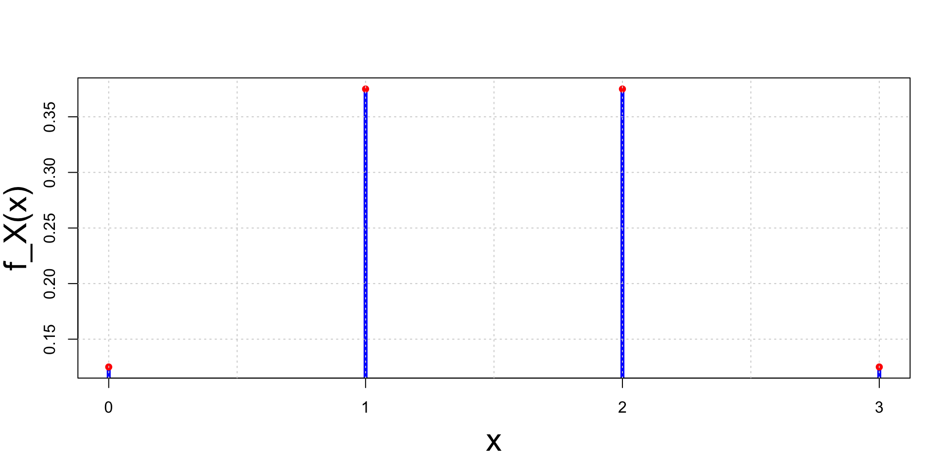 Hence the only interesting values of P_X are P(X=0) \,, \quad P(X=1) \,, \quad P(X=2) \,, \quad P(X=3)