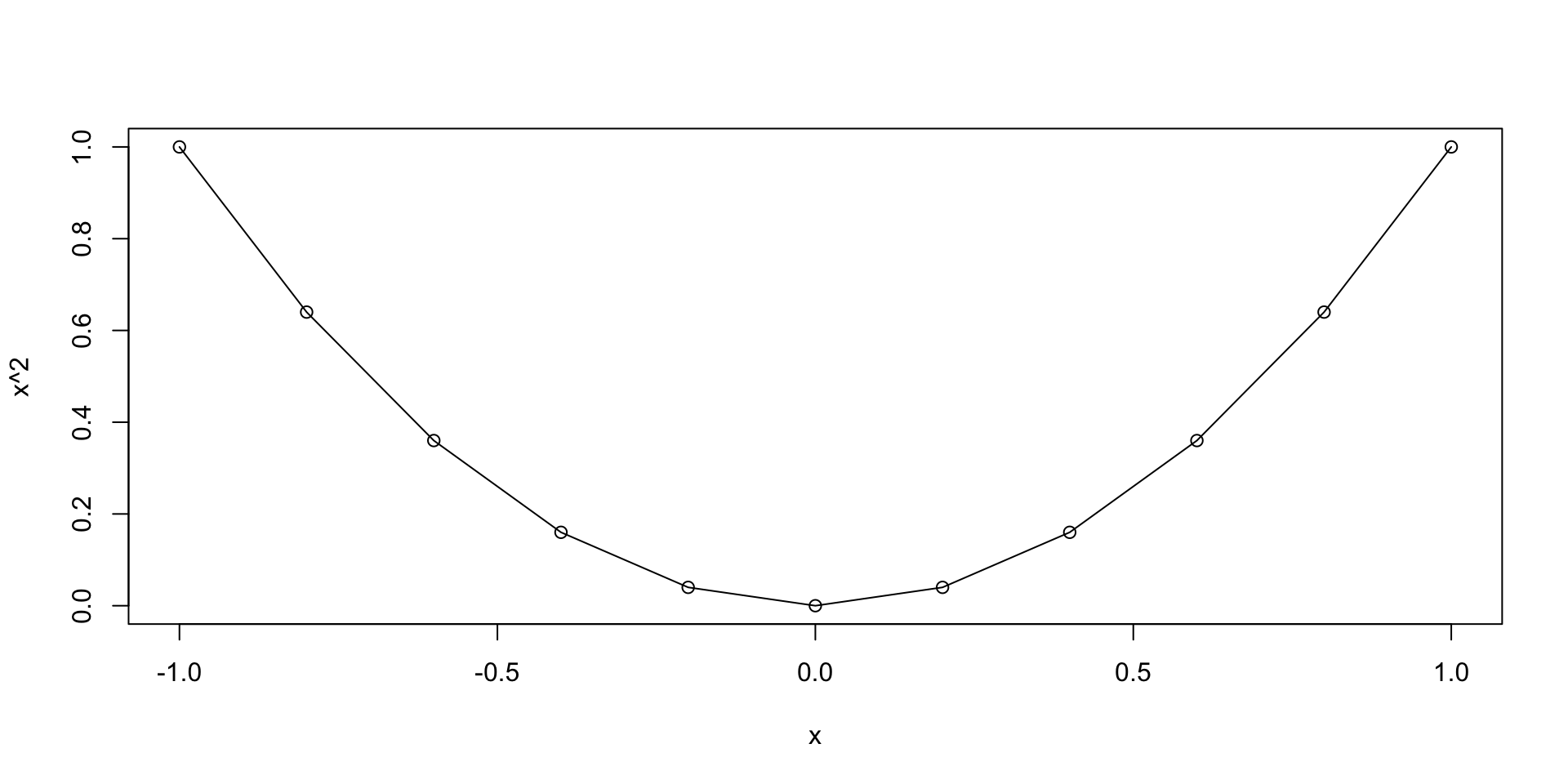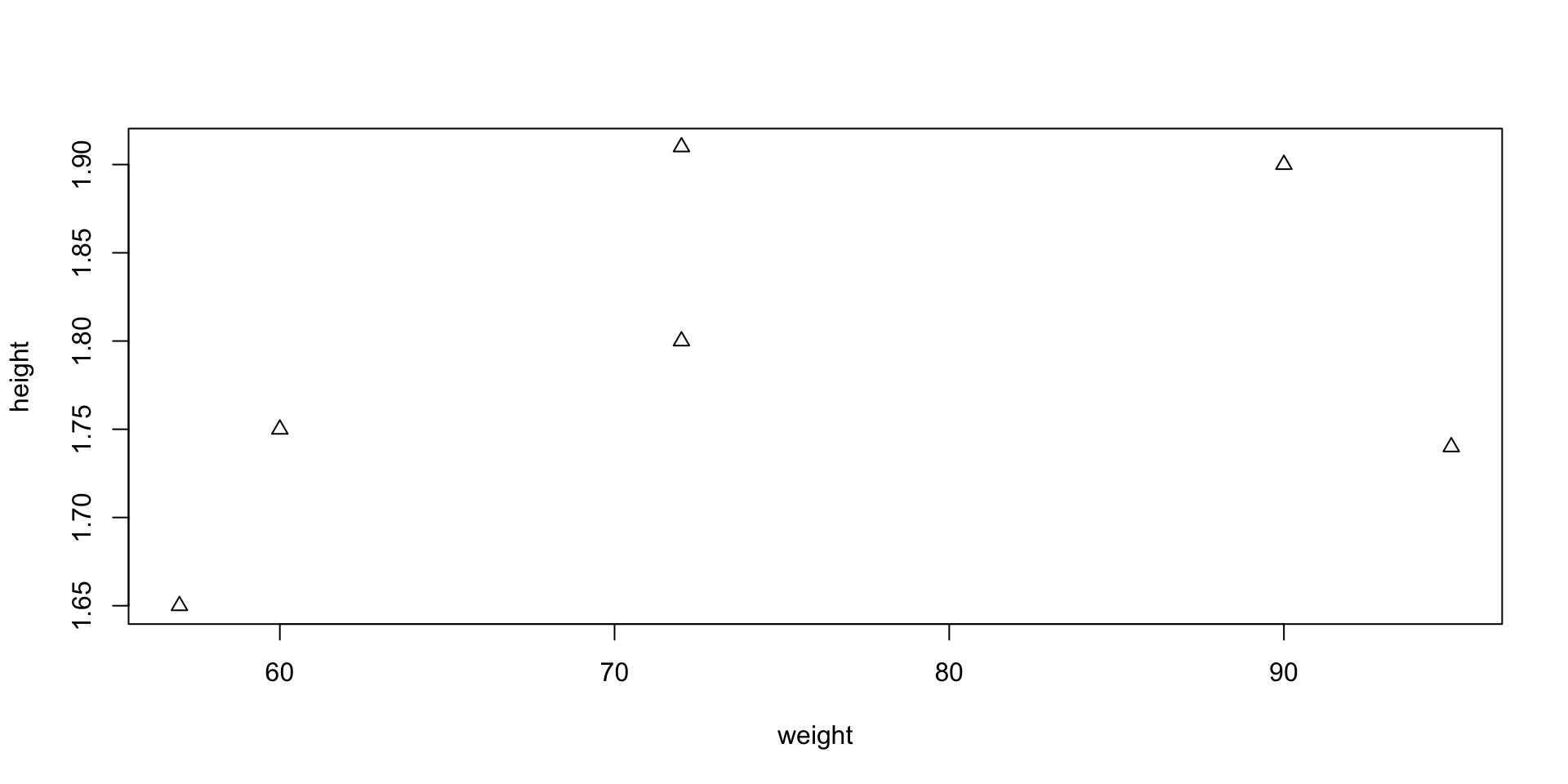 x and y of same lengthplot(x, y)Example: Suppose to have data of weights and heights of 6 people