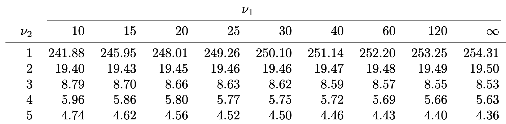 F_{21,5}(0.05) \approx \frac{F_{20,5}(0.05) + F_{25,5}(0.05)}{2} = \frac{ 4.56 + 4.52 }{ 2 } = 4.54