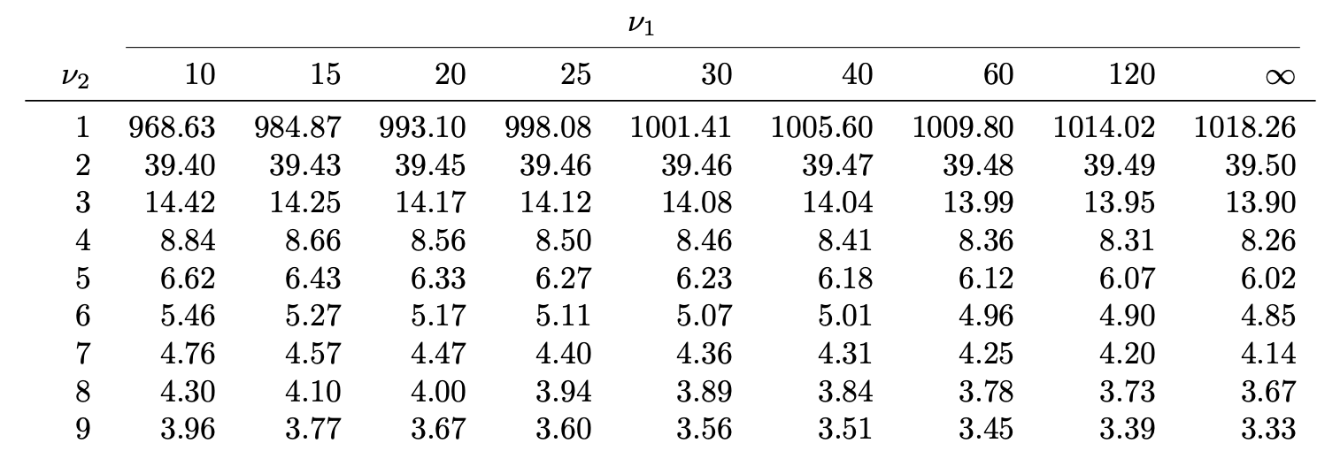 Table 4: Lists the values F_{\nu_1,\nu_2}(0.025), which means