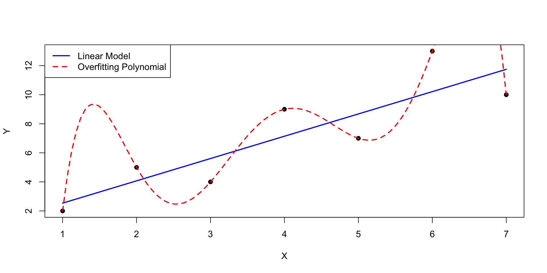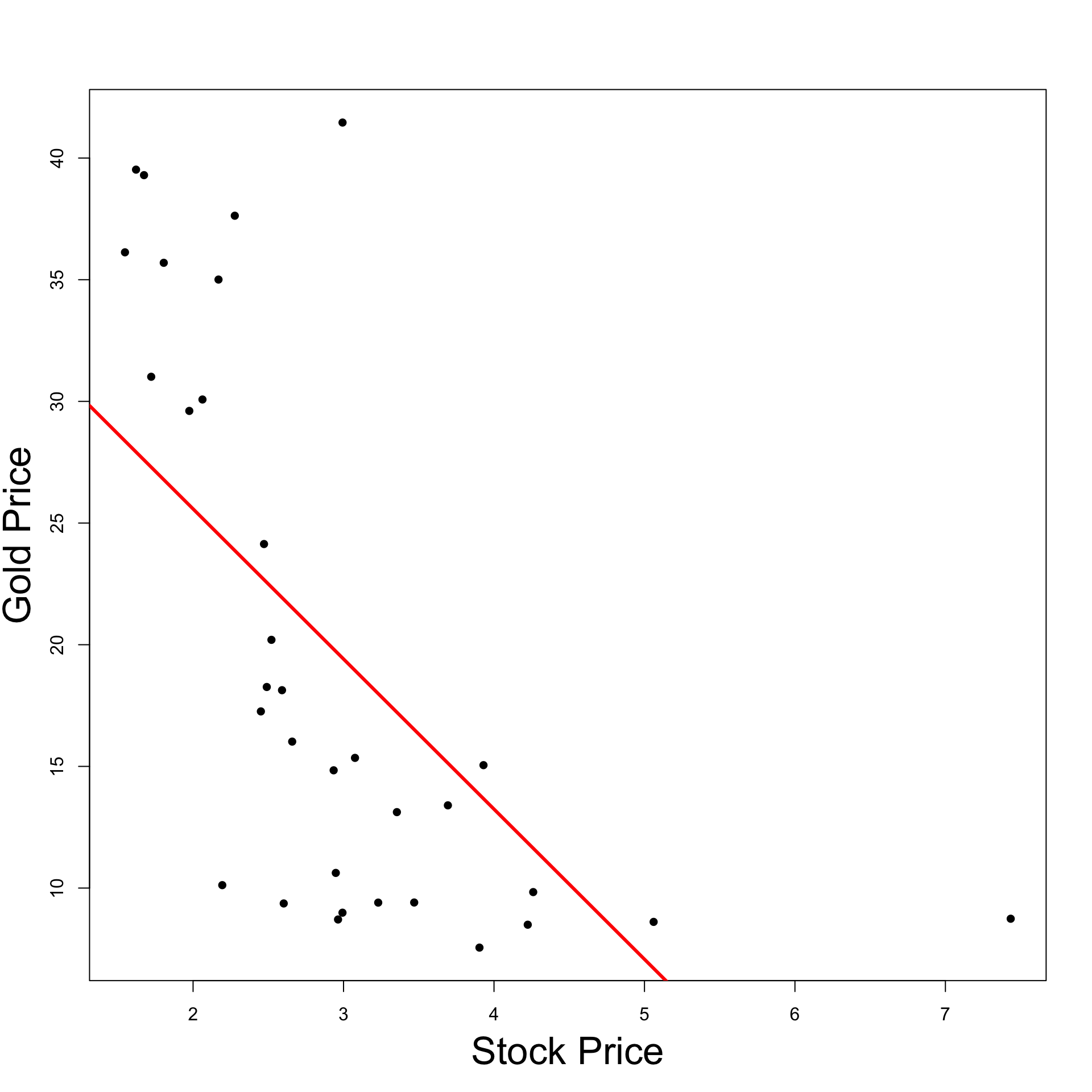 # Data stored in stock.price # and gold.price# Plot the dataplot(stock.price, gold.price, xlab ="Stock Price", ylab="Gold Price",pch =16)# Model stored in fit.model# Plot the regression lineabline(fit.model, col ="red", lwd =3)